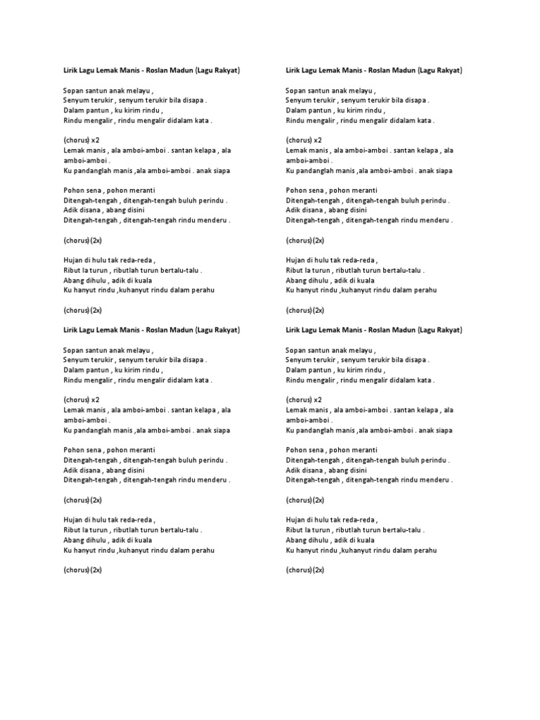 Lirik Lagu Lemak Manis from imgv2-1-f.scribdassets.com Roslan madun lemak manis dgn lirik. Download lagu gratis, gudang lagu az mp3 terbaru 2021. Rindu mengalir , rindu mengalir didalam kata. Temukan lagu dan video yang kamu cari dibawah lalu tekan enter! Download mp3 gratis ▶ lemak manis download lagu lemak manis dan streaming kumpulan lagu lemak manis mp3 terbaru gratis dan mudah dinikmati and full album. Download lagu lemak manis dan streaming kumpulan lagu lemak manis mp3 terbaru gratis dan mudah dinikmati, video klip lemak manis mp4, lirik lagu lemak manis full album. Ada 20 gudang lagu lemak manis terbaru, klik salah satu untuk download lagu mudah dan cepat. Ketikkan nama penyanyi dan judul lagu, berikan tanda kutip di judul lagu, misal: