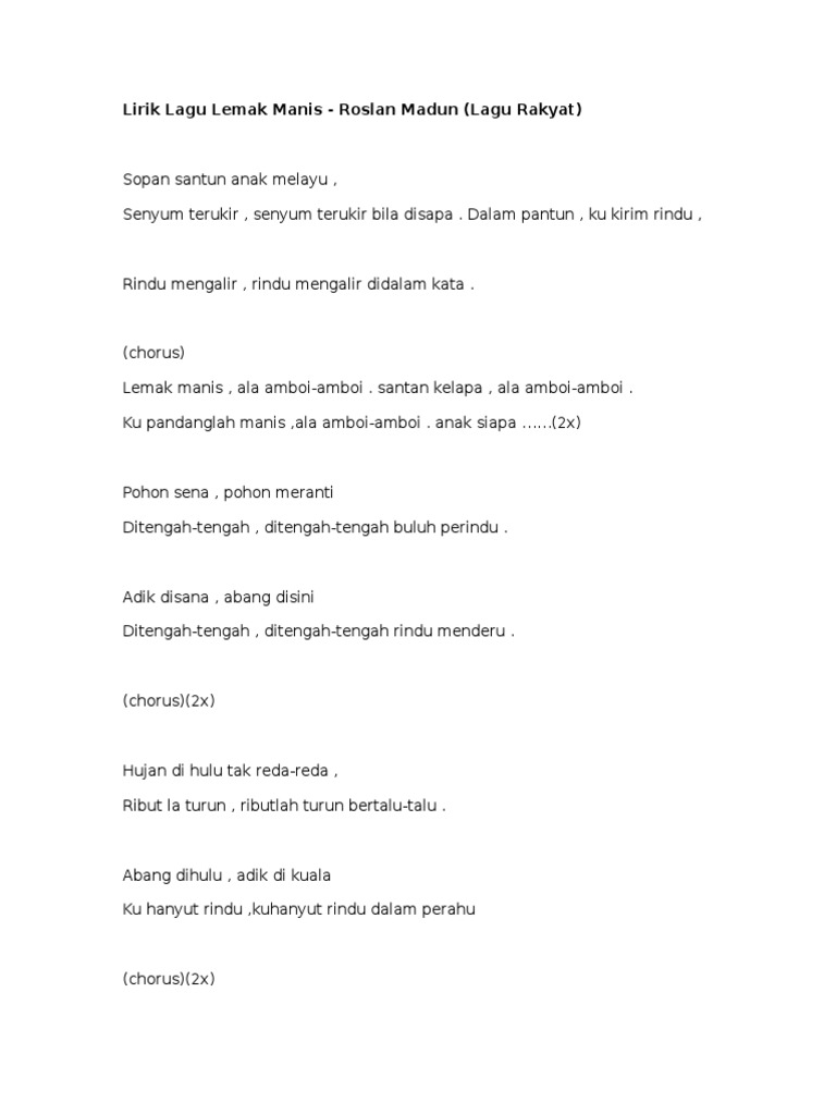 Lirik Lagu Rakyat Lemak Manis Dari Roslan Madun Zaza Iman Lifestyle Blogger from 1.bp.blogspot.com List download lagu mp3 lemak manis (5:39 min), last update apr 2021. Tersedia lirik lagu lengkap beserta data untuk para pengguna dan penikmat musik. Ini gimana lee ko o'om manis lee. Lemak manis terbaru gratis dan mudah dinikmati. Download mp3 lagu lemak manis gratis, ada 20 daftar lagu lagu lemak manis yang bisa anda download. Download your search result mp3, or mp4 file on your mobile, tablet, or pc. Dalam pantun , ku kirim rindu. Pilih satu link dari 15 daftar dibawah untuk melihat video mp4, detail informasi dan kumpulan lagu terkait.